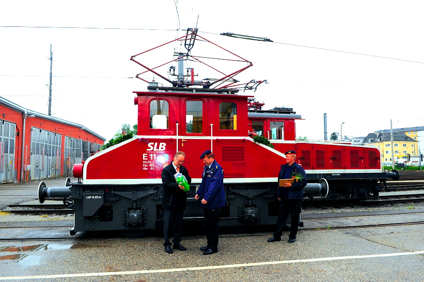 Nochmals ein Gruppenbild mit der festlich geschmückten E 11 vor der Remise (Blickrichtung Lokalbahnhof Salzburg). |