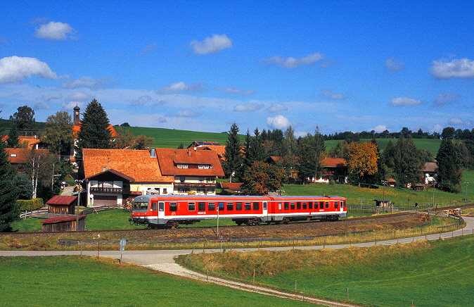 In der warmen Herbstsonne des 22. Oktober 2001 rollt ein 628.0 und ein 627.1 bei Lermoos unterhalb des Wettersteingebirge und der Zugspitze in Richtung Garmisch-Partenkirchen. Seit 2005 sind diese Einsätze der Dieseltriebwagen im Außerfern Geschichte. Die Fahrzeuge wurden zunächst ins Ausland verkauft. Inzwischen sind sie auch hier verschrottet worden. |