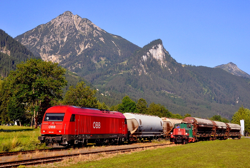 Die grüne 180 V der Firma Schretter & Cie. stellt am 26. Juli 2013 einige Wagen bereit, während die ÖBB 2016.042 mit ihrem Güterzug nach Hall in Tirol den Bahnhof Vils verlässt. In der Regel erledigt die im Jahr 2001 von der Grazer Schleppbahn erworbene O&K Diesellok der Fa. Schretter & Cie. den Verschub. An diesem Tag konnte die Jenbacher Diesellok in Vils beobachtet werden (Foto: Verkehrsarchiv Tirol). |