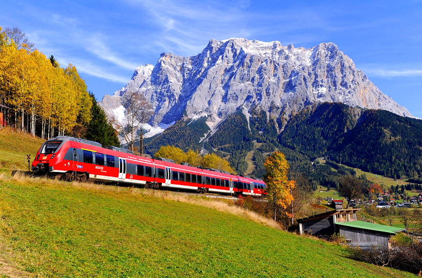 Unter dem Produktnamen Werdenfelsbahn verkehren die neuen Triebwagen der DB Baureihe 442 (Talent 2), des Herstellers Bombardier) auf den Strecken der Mittenwaldbahn (München - Garmisch-Partenkirchen - Innsbruck), der Außerfernbahn (Garmisch-Partenkirchen - Reutte in Tirol), der Ammergaubahn (Murnau - Oberammergau) und der Linie nach Kochel am See, die in Tutzing ihren Ausgangspunkt hat. Am 24. Oktober 2015 ist einer der neuen Triebwagen, die aufgrund ihrer charakteristischen Kopfform den Spitznamen “Hamster” tragen, unterhalb des Wetterstein-& Zugspitzmassivs nahe Lermoos unterwegs in Richtung Reutte in Tirol. |