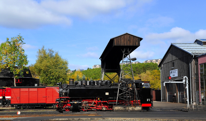 Kurz vor Oberwiesenthal überquert der Zug eine markante Trestlework Bücke. Im Hintergrund erkennt man die Fichtelberg Seilbahn (mit den gelben Stützen), sowie links im Bild die Ski Sprungschanze von Oberwiesenthal. Der Ort liegt auf 914 m Seehöhe und ist dadurch ein beliebtes Wintersportgebiet. Aber auch im Frühjahr, oder im Sommer kann man hier sehr schön Wandern, oder Rad fahren.