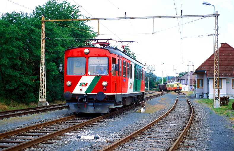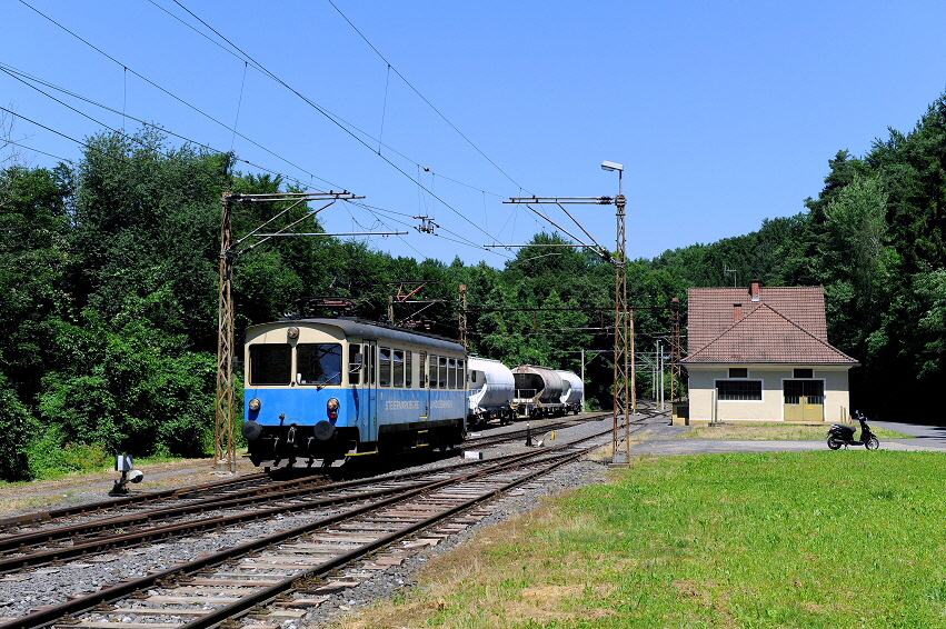 Am späten Nachmittag des 04. Juli 2017 hat der ET 1 soeben den Bahnhof von Maierdorf verlassen und strebt nun Bad Gleichenberg entgegen. Gleich hinter dem Bahnhof von Maierdorf erreicht der Zug die nächste Steigungsrampe mit bis zu 35 Promille. Dieser Abschnitt verläuft jedoch sehr windungsreich in einem dichten Waldgebiet. |