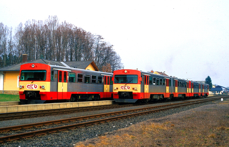 Im Bahnhof von Premstetten-Tobelbad gab es am 02. April 1993 eine Zug Überholung zweier Triebwagen der GKB Reihe VT 70. Gustav Stehno lichtete dort zunächst den ersten Zug aus Richtung Graz ab, bevor eine Doppeleinheit des VT 70 einige Zeit später dort einfuhr. |