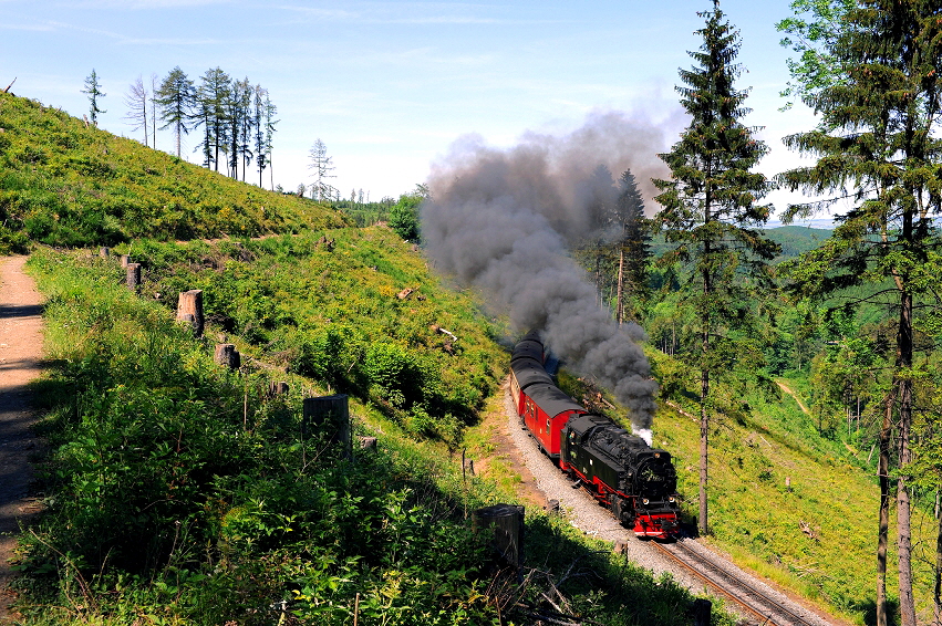 Am späten Nachmittag des 30. Mai 2011 ist ein Dampfzug von Wernigerode in Richtung Brocken unterwegs. Etliche Minuten zuvor hallen bereits die krachenden Auspuffschläge der Dampflok durch das Drängetal !! Kurz vor Drei Annen Hohne erreicht der Zug dann eine kleine Lichtung. Der Sonnenstand (von Mai bis August) eignet sich am Nachmittag für Züge aus Wernigerode ideal für stimmungsvolle Fotos, oder Videoszenen an dieser Stelle. |