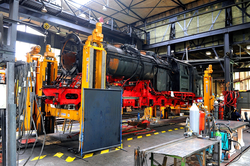 Unmittelbar neben dem Empfangsgebäude des Bahnhofes Wernigerode-Westerntor liegt der derzeitige Werkstattbereich der Harzer Schmalspurbahn (HSB). Hier werden die Untersuchungen und div. Erhaltungsarbeiten an Dampf-u. Diesel Lokomotiven, sowie an den Triebwagen ausgeführt. Komplette Hauptuntersuchungen werden derzeit (noch) im bekannten DB AG Dampflok-Werk Meiningen (Thüringen) ausgeführt. In den nächsten Jahren wird ein komplett neuer Werkstattbereich (Gläserne Eisenbahn Werkstatt) zwischen der Station Wernigerode-Westerntor und der Einfahrt in den Hauptbahnhof von Wernigerode (Osterteich Gelände) errichtet. Die Fertigstellung ist für 2021 geplant. Somit werden die Aufnahmen aus dem derzeitigen Werkstatt Bereich in Kürze zu den historischen Bilddokumenten gehören. Zur Zeit kann man Freitags (außer an Feiertagen) gegen Voranmeldung mit einer Gruppe von bis zu 20 Personen den Werkstattbereich besichtigen. Die hier gezeigten Bilder entstanden am 03. Januar 2014, bzw. 26. Mai 2016 im Rahmen einer offiziellen Führung durch die HSB Werkstatt. |