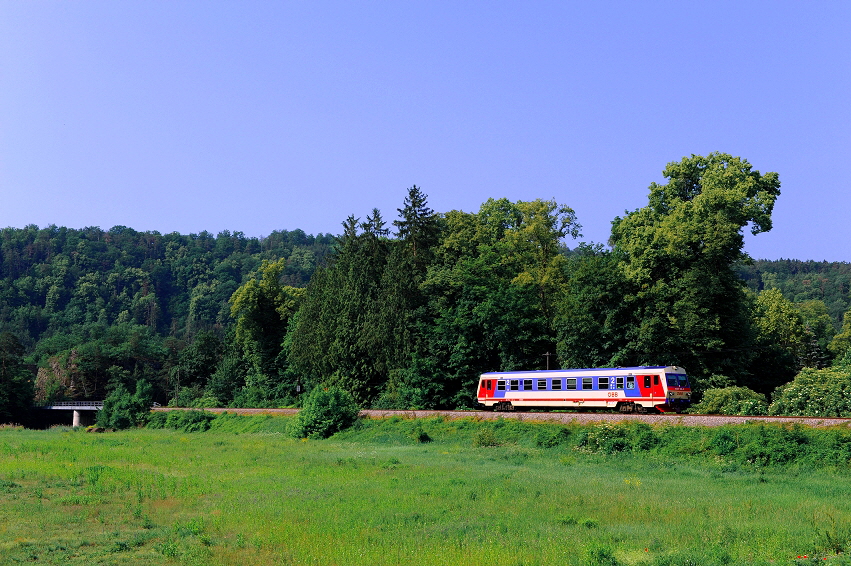 Im Jahr 1997 hatte man bei Stiefern noch einen Blick auf die alte Kamp Brücke. Leider war der Blick zum Zeitpunkt der Aufnahme durch hochgewachsene Bäume teilweise versperrt. Am Morgen des 18. August 1997 ist ein unbekannt gebliebener Triebwagen der Reihe 5047 mit einem Fahrrad Transportwagen in diesem Bereich auf dem Weg in Richtung Hadersdorf am Kamp /bzw. Krems an der Donau. |