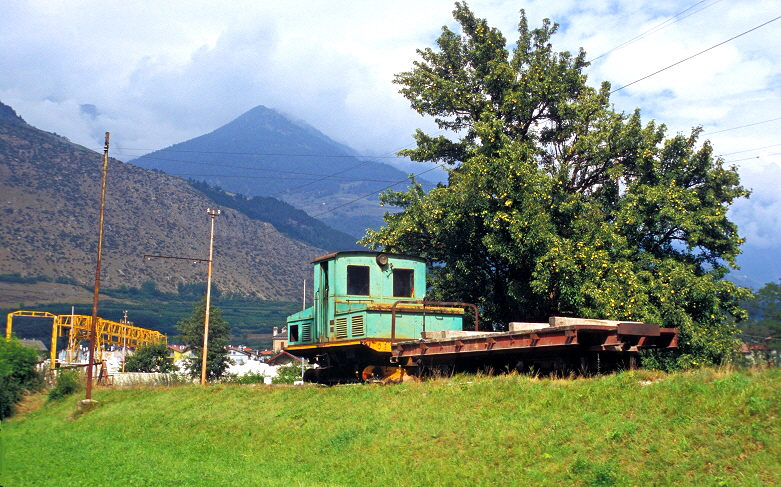 Gegen Mittag des 29. August 2005 hat die Tal Lokomotive soeben das Werksgelände in Laas verlassen und bereits die Brücke über die Etsch hinter sich gelassen und schiebt einen Leerwagen bis zur Schrägbahn vor sich her. |