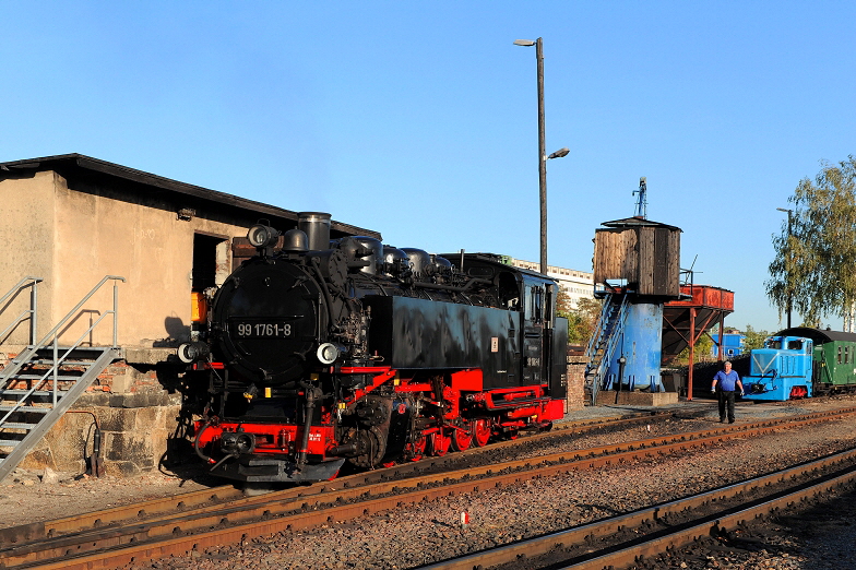 Nach rund 17 Kilometern erreicht der Zug den Bahnhof von Radeburg. Kurz nach der Ankunft wird die Lokomotive vor dem schönen alten Lokschuppen mit Wasser versorgt und die Lok für die Rückfahrt nochmals kurz abgeschmiert. Am 05. Oktober 2018 nutzten viele Fahrgäste, bei sehr warmen Temperaturen von bis zu 25 Grad den Dampfzug. |