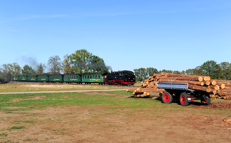 Am Nachmittag des 05. Oktober 2018 erreicht der Dampfzug aus Richtung Radeburg den Ortsbereich von Berbisdorf. Zu dieser Zeit wurde in diesem Bereich gerade Holz verladen. Ein Anhänger aus DDR Produktion wartet auf den Abtransport. |