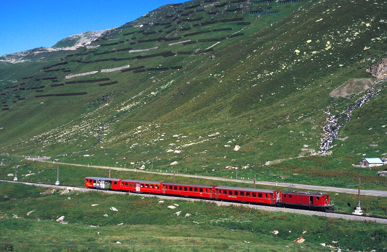 Im Zuge einer sog. “Bewegungsfahrt” ist am Morgen des 22. Juli 2002 die betagte HGe 4/4 I. (No. 36) für den Regionalzug nach Disentis/Mustér eingeteilt. Kurz vor dem Oberalp Pass auf 2044 m Seehöhe wird der Zug gleich in einer Lawinenschutzgalerie verschwinden. Der freundliche Fahrdienstleiter im Bahnhof von Andermatt gab den Tipp über den Einsatz dieser markanten Baureihe. |