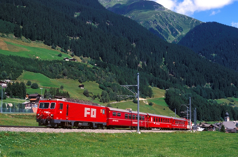 Sehr schön liegt der kleine Viadukt über das Val Giuv bei Dieni. Am Morgen des 24. Juli 2002 rollt zunächst ein kurzer Regionalzug nach Sedrun vorüber, bevor die HGe 4/4 I. (No. 36) das Bauwerk passiert. Die Lok fährt an diesem Tag bis Disentis. Für diesen Einsatz war eigentlich eine HGe 4/4 II. geplant, aber da sich einige Eisenbahnfreunde am Abend zuvor nach dieser Lok erkundigt hatten, wurde die betagte Maschine für diesen Umlauf nochmals eingesetzt. Im “Bahnland Schweiz” gehen die Uhren (zum Glück) ab und zu noch etwas anders !! |
