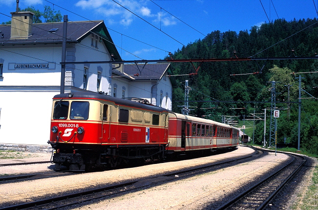 Am 02. August 1986 rollt die 1099.04 in der Einfahrt des Bahnhofes von Mariazell an der 1099.12 vorbei. Gustav Stehno war an diesem Tag dort zur Stelle. |