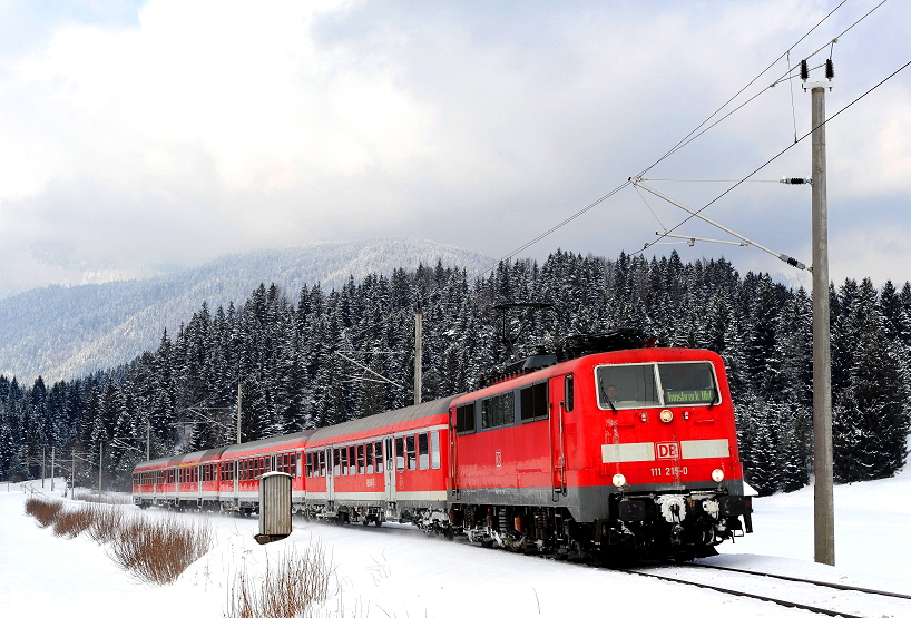 Gegen Mittag des 03. Januar 2012 rollt die DB AG 111 026-1 am Seefelder Golfplatz vorüber in Richtung Innsbruck. Starke Schneefälle sorgten Anfang Januar 2012 an dieser Stelle dafür, dass vom Zaun am Bahndamm nur noch die Spitzen aus dem hohen Schnee heraus ragten. Etwas mühsam gestaltete sich daher auch die Wahl des Fotopunktes, der eine Position nur von einem gefrorenen Schneehaufen aus ermöglichte. |