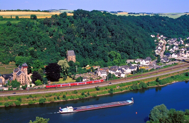 In Höhe der kleinen Ortschaft Neef ist am 13. Juli 1993 eine unerkannt gebliebene DB Lokomotive der Baureihe 140 mit einem Schnellzug in Richtung Trier unterwegs. Bedingt durch eine hochgewachsene Hecke (am Bahndamm), die gleichzeitig als Lärmschutz dient ist dieser Fotopunkt heute nicht mehr umsetzbar. |