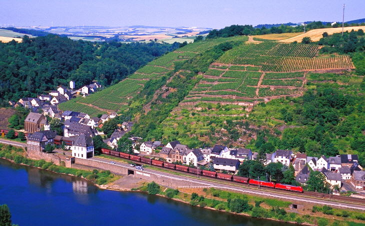 Von einem Aussichtspunkt in den Weinbergen, oberhalb des Ortsteils von Treis hat man einen Ausblick auf die Mosel und die kurvenreiche Linienführung der Moselstrecke kurz vor dem Bahnhof Treis-Karden. Am 16. Juli 1993 ist eine unerkannt gebliebene Lokomotive der Baureihe 150 mit einem langen Güterzug in Richtung Koblenz unterwegs. |