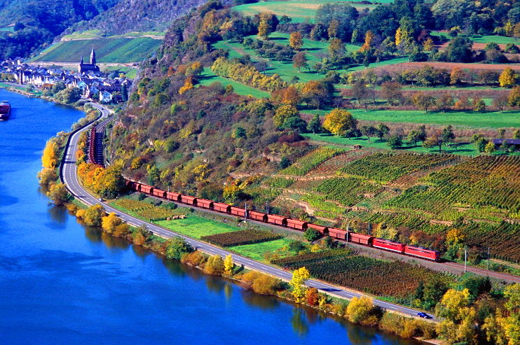 Kurz vor Bullay (auf der gegenüberliegenden Seite der Mosel befindet sich der kleine Ort Alf) passiert am 13. Oktober 2003 zunächst ein Intercity mit einer 181er und im Anschluss eine DB Lok der Baureihe 141 mit einem Nahverkehrszug ein kleines Viadukt. Inzwischen sind die Bäume an dieser Stelle höher gewachsen und machen derartige Fotos in der heutigen Zeit leider unmöglich. |