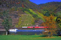 Am 13. Oktober 2003 präsentiert sich der Herbst von seiner schönsten Seite, als die beiden 151er mit einem Erzwagen Leerzug aus dem Saarland die Bullayer Moselbrücke in Richtung Koblenz befahren. |