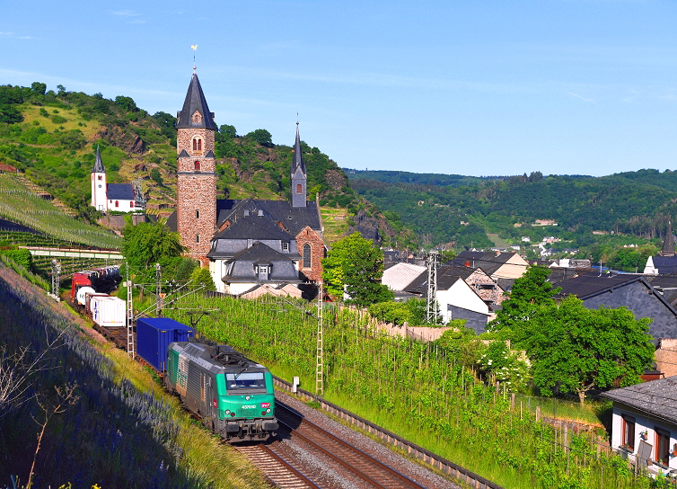 Im letzten Abendlicht des 26. Mai 2020 fährt eine SNCF “FRET” Lokomotive der Reihe BB 37 (ALSTOM “Prima”) in der klassischen grünen “FRET” Lackierung mit einem langen Containerzug an den beiden Kirchen von Hatzenport in Richtung Trier. Im Hintergrund liegt unmittelbar neben dem Friedhof von Hatzenport die katholische Kirche St. Johannes (aus dem 13. Jahrhundert), davor erhebt sich die ebenfalls katholische Pfarrkirche St. Rochus, die im Jahr 1869/70 errichtet wurde. |