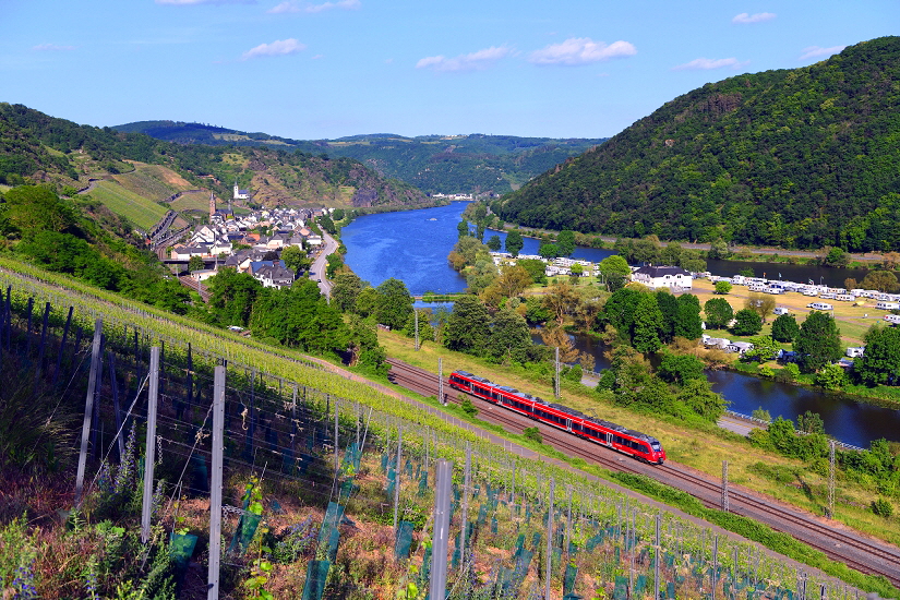 Am Vormittag des 28. Mai 2020 fährt ein DB Triebwagen der Baureihe 425 in wenigen Augenblicken in den Bahnhof von Treis-Karden ein. |