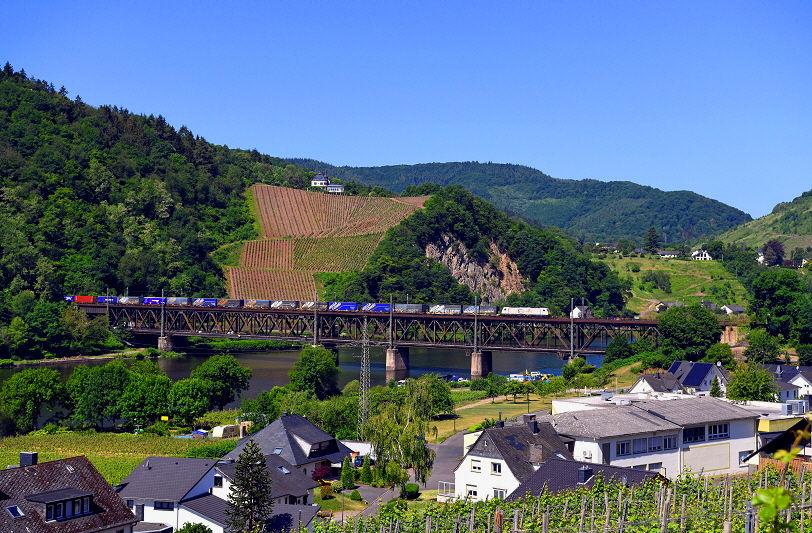 Am 29. Mai 2020 zieht eine DB AG Lokomotive der Baureihe 185 einen leeren Autotransportzug in Richtung Trier. Kurz nach dieser Aufnahme wurden die Schatten am Bahngleis immer länger, so dass wir uns entschlossen den Tag in unserem Hotel bei einem guten Abendessen und einem Mosel Riesling ausklingen zu lassen. |