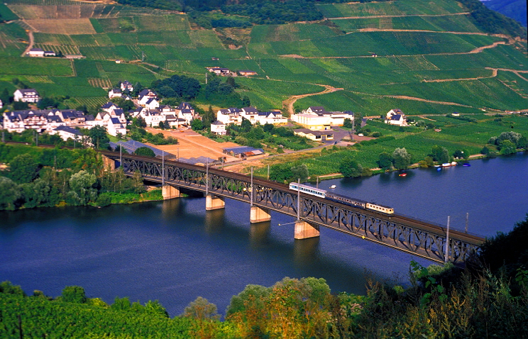 Am späten Abend des 10. Juli 1993 fahren zunächst ein Nahverkehrszug mit einer Lokomotive der Baureihe 141 und in kurzer Folge ein Schnellzug mit einer blauen 181er in Richtung Trier. Die markante Doppelstockbrücke bei Bullay hat eine Länge von 314 m und wurde im Jahr 1878 fertiggestellt. |