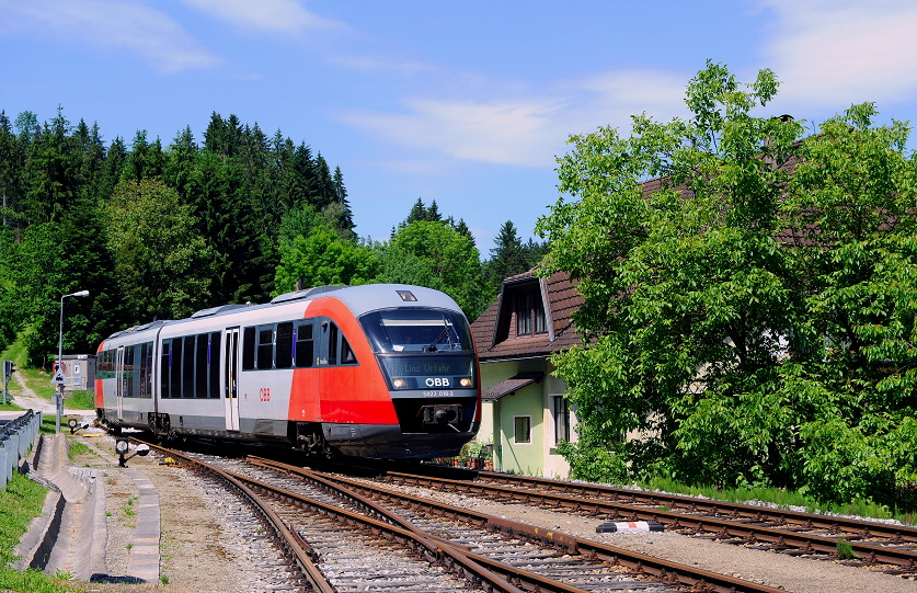 Am frühen Nachmittag des 08. Juni 2019 erreicht der 5022 018-3 (Desiro) den Bahnhof von Haslach an der Mühl. Das Zentrum von Haslach liegt rund drei Kilometer vom ÖBB Bahnhof Haslach entfernt. |