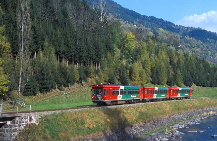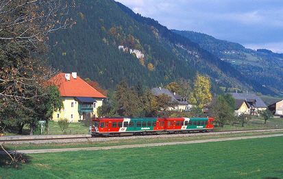 Sehr bunt präsentiert sich eine Triebwagen Garnitur am 13. August 1998 am Ufer der Mur bei Madling. Der angehängte Postwagen wurde nicht mehr in das neue Farbkonzept umlackiert, da wohl schon fest stand das die Postverladung auf der Bahn keine große Zukunft mehr hatte. Einige Jahre später wurde der Postkurs per Bahn gestrichen und so verstopft nun ein LKW mehr die Straßen im Murtal. Den Angler scheint der vorbei fahrende Zug nicht zu stören. Besonders schön ist auch die alte Holzbrücke über die Mur. Der Postwagen wurde zwischenzeitlich nach Rumänien verkauft. |