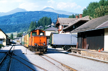 Am 11. August 1998 verschiebt die VL 12 im Bahnhof von Murau, während der Triebwagen auf seinen nächsten Einsatz wartet. Die Szenerie mit Burg und Kirche läßt sich leider in dieser Form nicht mehr fotografieren, da hier nun ein modernes Bahnsteigdach aus Holz den Blick versperrt. |