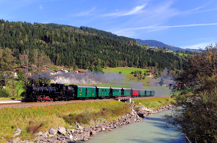 Ralf Kirion konnte den Sonderzug zur “Schmalspur-Expo” am 03. Oktober 2010 zwischen den Stationen Hollersbach und Rettenbach auf der Rückfahrt nach Zell am See, am Ufer der Salzach schön in Szene setzen.