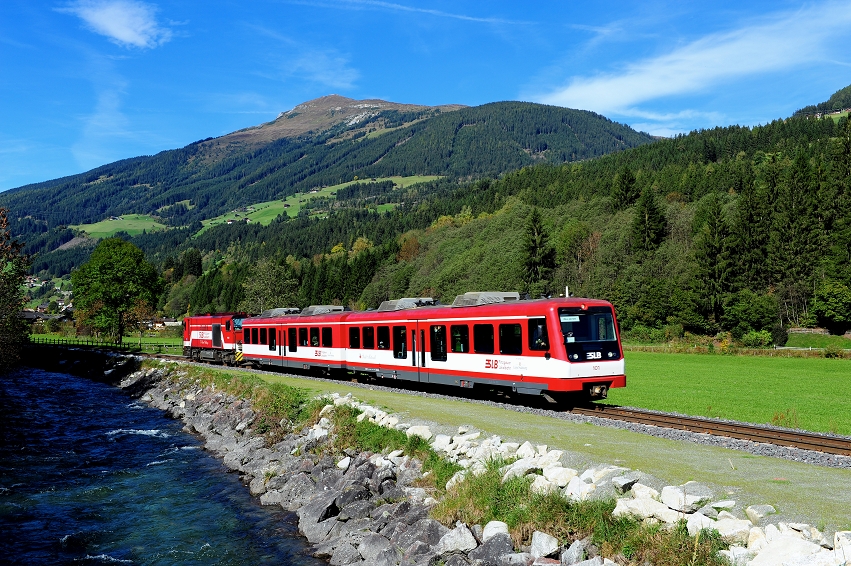 Der weitere Streckenverlauf zwischen Rettenbach und Hollersbach läuft ebenfalls nahe am Ufer der Salzach entlang. Am 04. Oktober 2010 sind hier zwei Triebwagen auf dem Weg nach Krimml im Einsatz.