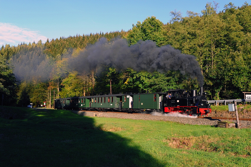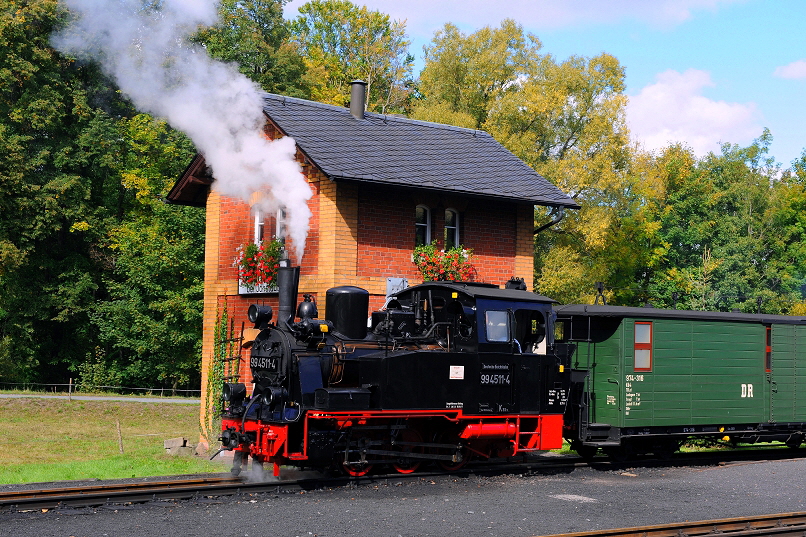 Im idyllisch gelegenen Bahnhof von Schmalzgrube hat die 99 4511-4 soeben den Auftrag zur Abfahrt erhalten und strebt am 29. September 2018 der Endstation Jöhstadt entgegen. Nachfolgend weitere Impressionen aus dem Bahnhof von Schmalzgrube. |