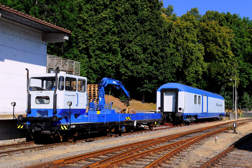 Im Bahnhof von Viechtach wartet am 21. Juli 2013 ein Rottenkraftwagen in der neuen Lackierung der Länderbahn auf einen Einsatz. Dahinter steht dann noch ein in der Werkstatt in Viechtach vor einigen Jahren umgebauter Postwagen. Dieser Wagen dient dem Bauzugdienst als Werkstatt-& Verpflegungsstation. |
