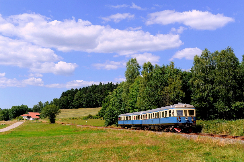Bei Gumpenried-Asbach passiert der Zug den aufgestauten Schwarzen Regen. Am Morgen des 21. Juli 2013 spiegelt sich dort der VT 07 im besten Licht. In diesem Streckenabschnitt befindet sich die Bahn weitab jeglicher Zivilisation. In den 1980er Jahren wurde der alte Bahnhof Gumpenried-Asbach im Zuge eines Kraftwerkbaues abgebrochen. Der Schwarze Regen wurde zur Stromerzeugung aufgestaut und die Bahnlinie höher gelegt. Ein neuer Haltepunkt dient heute der Wanderbahn als Abfahrtsstelle. |
