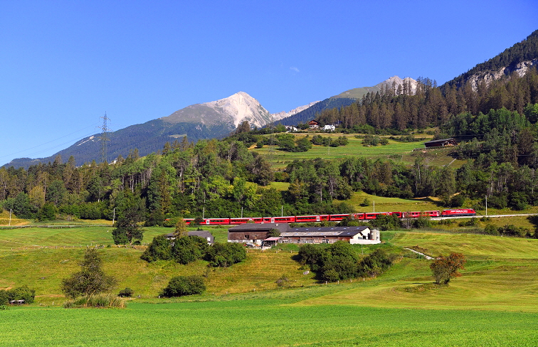 In einer Höhe von 65 Meter über dem Talgrund wird das Tal der Landwasser in einem engen Bogen überquert. Am späten Nachmittag des 26. August 2010 befördert die Glacier-Express Lokomotive Ge 4/4 III. (No. 651) den gleichnamigen Schnellzug von Chur bis St. Moritz.