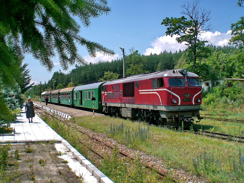 In der Region zwischen Sveta Petka und Belice lebt eine Gruppe, die dem Volksstamm der Pomaken angehört. Zur Erläuterung: Die Pomaken sind Bulgaren, die sich während der türkischen Zeit zum Islam bekehrt hatten. Von diesem Volksstamm leben heute alle ca. 300.00 Pomaken in den Rhodopen. Daher finden sich in diesem Bereich auch einige weiße Moscheen mit ihren Minaretten. Am 05. Juli 2009 fotografierte Ralf Kirion den Personenzug 16103 mit der 77.008 vor Cherna Mesta.