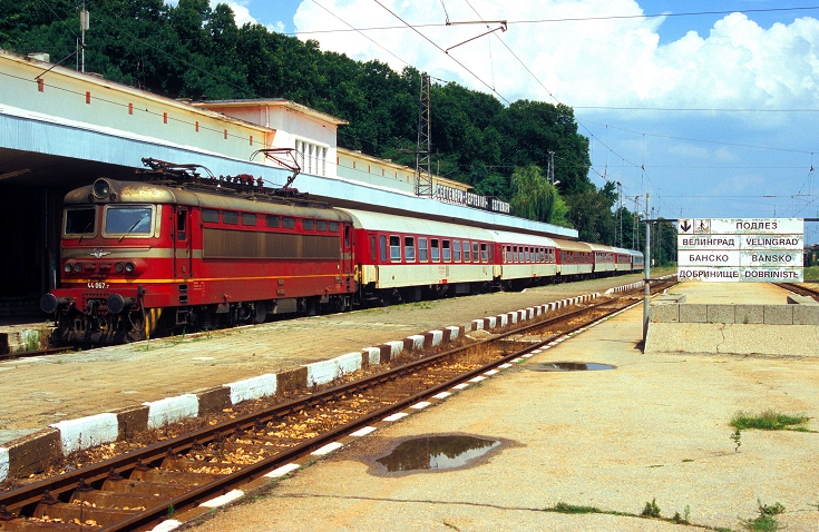 Am 05. Juli 2009 verlässt eine typische Zuggarnitur der Rhodopenbahn den Bahnhof von Belica (Foto: Ralf Kirion).
