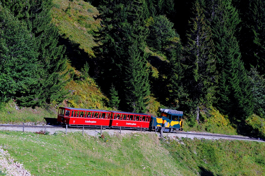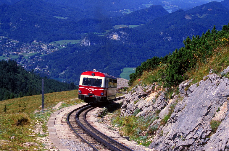 Mit 260 Promille (!!) führt die Strecke in der maximalen Neigung bis zum Endpunkt Schafbergspitze. Die Z 13 (SLM/ Winterthur, CH) meistert die Steigung am 25. September 2012 ohne Schwierigkeiten. Den Fahrgästen bieten sich traumhafte Ausblicke auf die Seen & Berge des Salzkammergutes !! Die Fahrpreise sind im Gegensatz zu so mancher Bergbahn in der Schweiz sehr Familienfreundlich ausgelegt. |