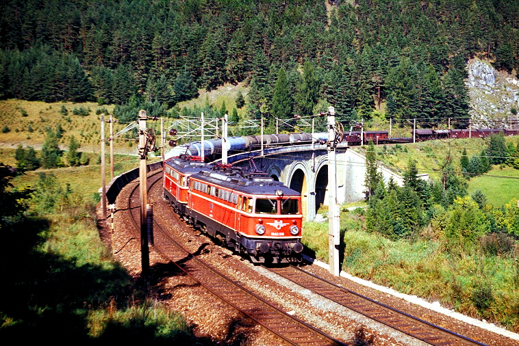 Zwei Lokomotiven erreichen mit einem schweren Güterzug am Nachmittag des 30. Juni 1995 den Bahnhof Semmering. Die Vorspann- Lok (1042.568) wird nach Ankunft des Zuges auf der Passhöhe abgekuppelt und wird einen Güterzug als Brems- Lok nach Payerbach befördern. In Payerbach und Mürzzuschlag werden die Vorspann-Lokomotiven bereitgehalten. Ein Schiebebetrieb wie auf anderen Gebirgsbahnen ist aufgrund der sehr engen Bögen am Semmering verboten. |