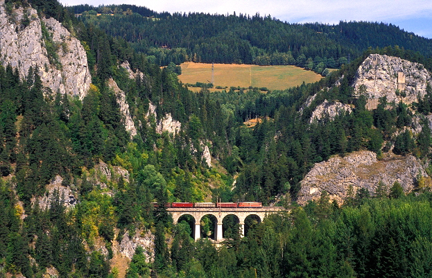 Kurz vor der Station Semmering auf 896 m Seehöhe überquert ein langer Güterzug am Abend des 01. August 1999 den Viadukt über den unteren Adlitzgraben. Zum Zeitpunkt des Baues der Semmeringbahn wurde das Viadukt im Volksmund auch als “Fleischmannbrücke” bezeichnet. |