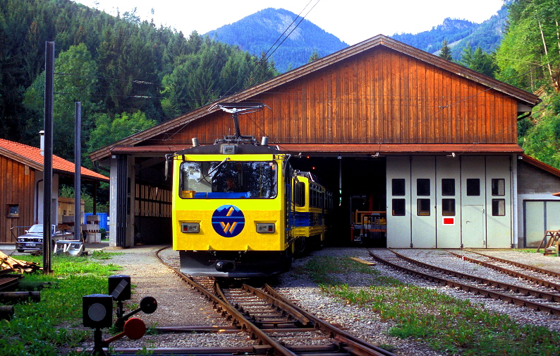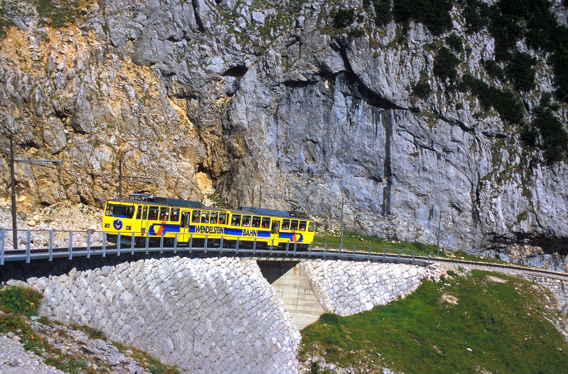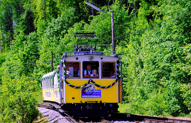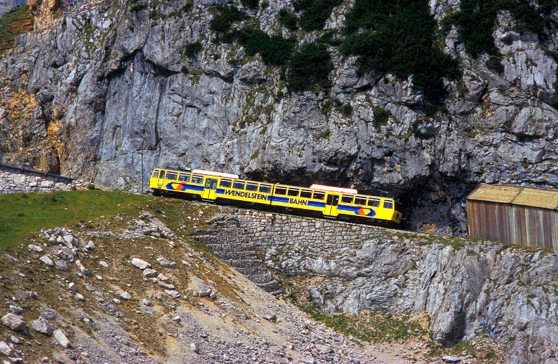 Von der kleinen Kapelle auf dem Wendelstein (Bild oben) und vom Wanderweg darunter (Bild unten) hat man einen schönen Blick auf die Trassierung der Wendelsteinbahn im Bereich der “Hohen Mauer”. Am Morgen des 14. September 2012 hat der Zug soeben die Lawinenschutzgalerie verlassen und passiert gerade den sog. “Reindler Kessel”. |