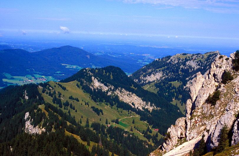 Mit einem leichten Weitwinkel Objektiv erhält man einen Panorama Blick auf die umliegenden Berge. In dieser Einstellung wirkt dieser Streckenabschnitt völlig anders, als bei den oberen Fotos die mit einem leichten Tele- Objektiv entstanden sind (14. September 2012). Das Bild entstand wieder vom Wanderweg unterhalb des Wendelsteinkircherl. |