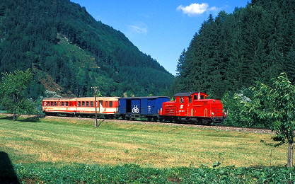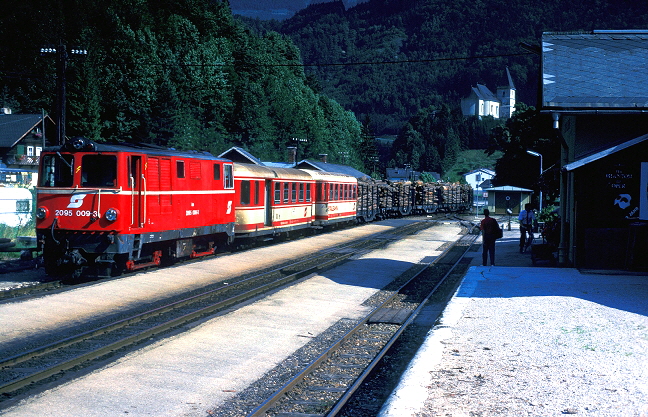 Bis in die 1990er Jahre wurde der damals noch täglich an Werktagen geführte Güterzug als Personenzug mit Güterbeförderung (PmG) angeboten. Aufgrund der langen Fahrzeit von Lunz a. See bis Waidhofen a. d. Ybbs nutzen zumeist nur ältere Fahrgäste und Eisenbahnfreunde dieses Zugangebot. Am 28. Juli 1990 ist die 2095.09 mit dem PmG aus Richtung Lunz a. See in den Bahnhof Groß Hollenstein eingefahren. Dort werden noch weitere Holzwagen aus dem heute noch bedienten Anschlussgleis abgeholt. Mit 17 (!!) Holzwagen und zwei Personenwagen war die 2095.09 an diesem Tag an der Belastungsgrenze angelangt. Der Güterzug verkehrte in der Regel zuletzt nur noch am Dienstag (wenn Werktag). Im Hintergrund erhebt sich die Pfarrkirche der Gemeinde Groß Hollenstein. Die Firma KMI (Kärntner Montanindustrie) sorgte in Groß Hollenstein bis zuletzt für ein regelmäßiges Frachtaufkommen. |