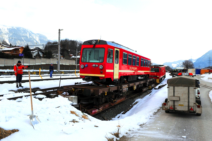 Die Abladung des VT 1 (Bezeichnung der Zillertalbahn, VTs 11 /SLB Beschriftung/ex. ÖBB 5090.001) in Jenbach am 18. Februar 2013 |