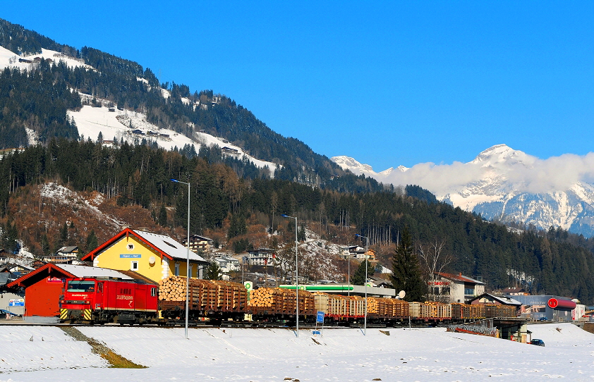 Auf dem Weg nach Fügen-Hart passiert am 18. Februar 2013 ein langer Güterzug mit der Diesellok D 14 den ehem. Anschluss der Fa. Kolbitsch (bei Schlitters). Die Firma musste vor einigen Jahren Insolvenz anmelden, nachdem Holzlieferanten aus Osteuropa die Preise auf dem Holzmarkt zum Nachteil vieler Firmen in Österreich & Deutschland beeinflusst hatten. Kleinere Betriebe wie die Fa. Kolbitsch konnten auf dem ohnehin hart umkämpften Markt leider nicht bestehen. |
