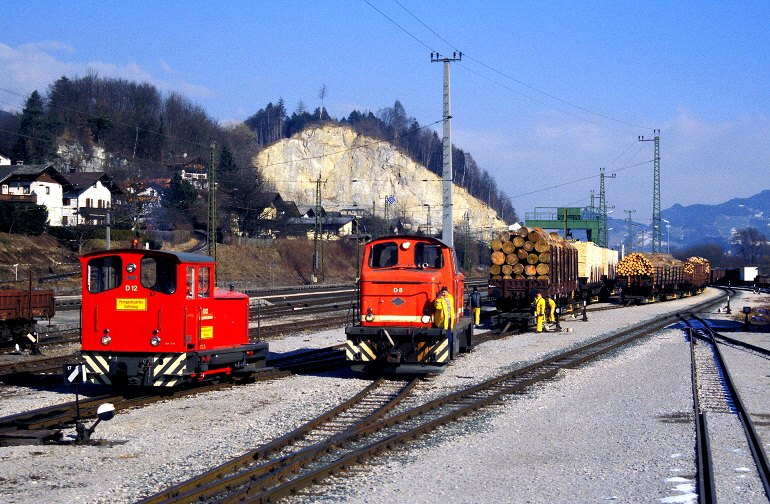 Die Holzfracht die von der eigenen D 10 am 07. Februar 2000 bis Fügen gebracht wurde, bestand aus vier normalspurigen Holzwagen. In Kürze wird der Zug auf das Anschlussgleis der Firma Binder weiterfahren. Dort werden die mit Rundholz beladenen Wagen mit speziellen Fahrzeugen geleert und teilweise mit Schnittholz wieder beladen. Danach erfolgt die Rückreise in Richtung Jenbach. Ralf Kirion fotografierte im Bahnhof Fügen- Hart. |