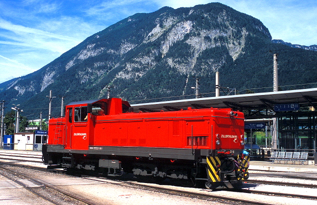 Aufgrund der Ausbesserung eines Unfall Schadens an der Gmeinder Diesellok D 14, setzte die Zillertalbahn eine Zeit lang die D 10 (ex. JZ 740.007) vor einigen Personenzügen ein. Am 21. Mai 2009 wird die markante Maschine gleich in den Bahnhof Strass i. Zillertal einfahren. |